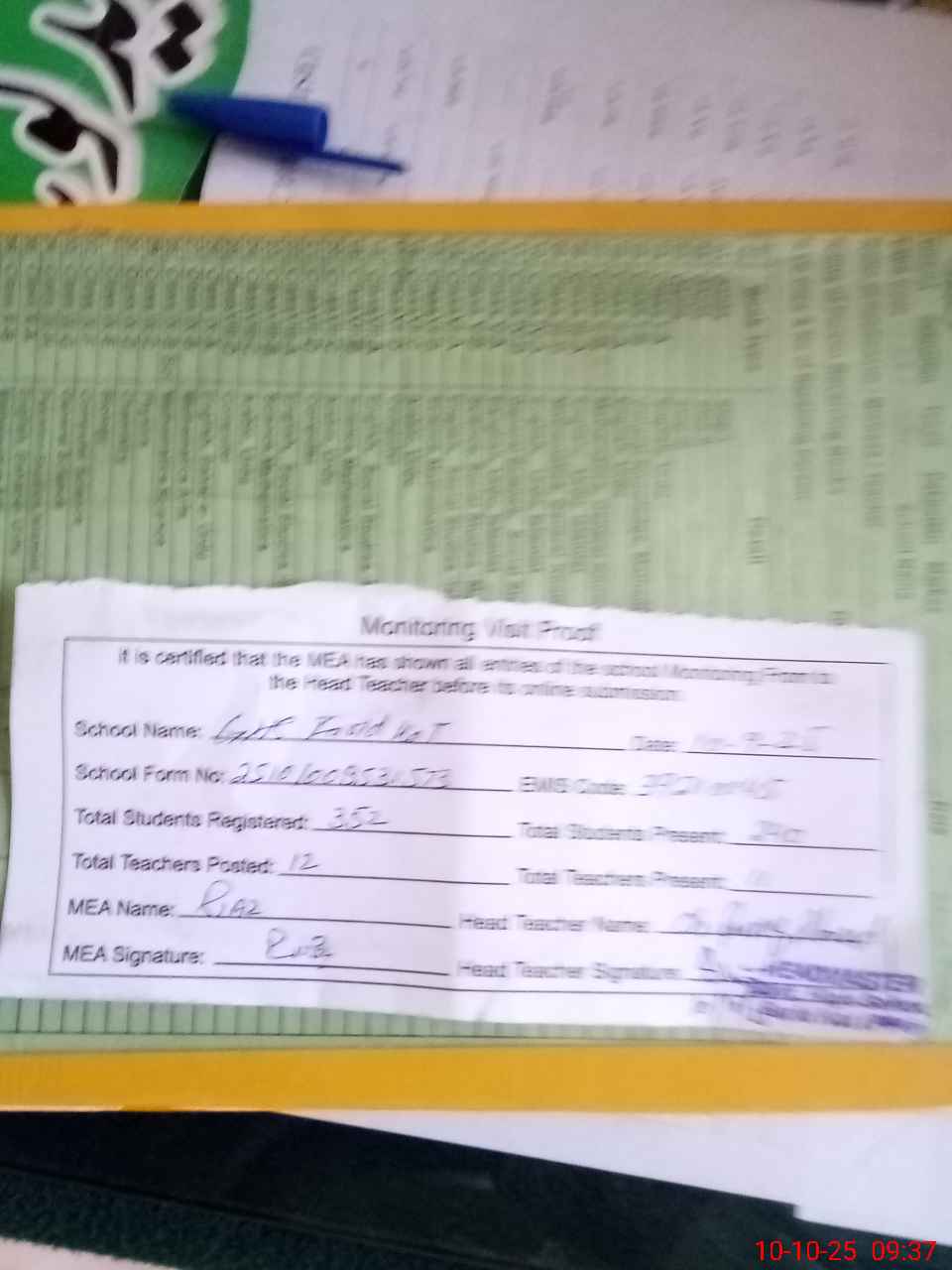 | Attendance Register | Head Teacher | MEA with School | Visit Proof |