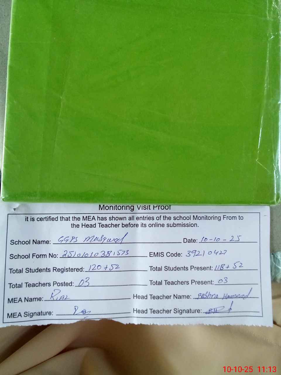 | Attendance Register | Head Teacher | MEA with School | Visit Proof |