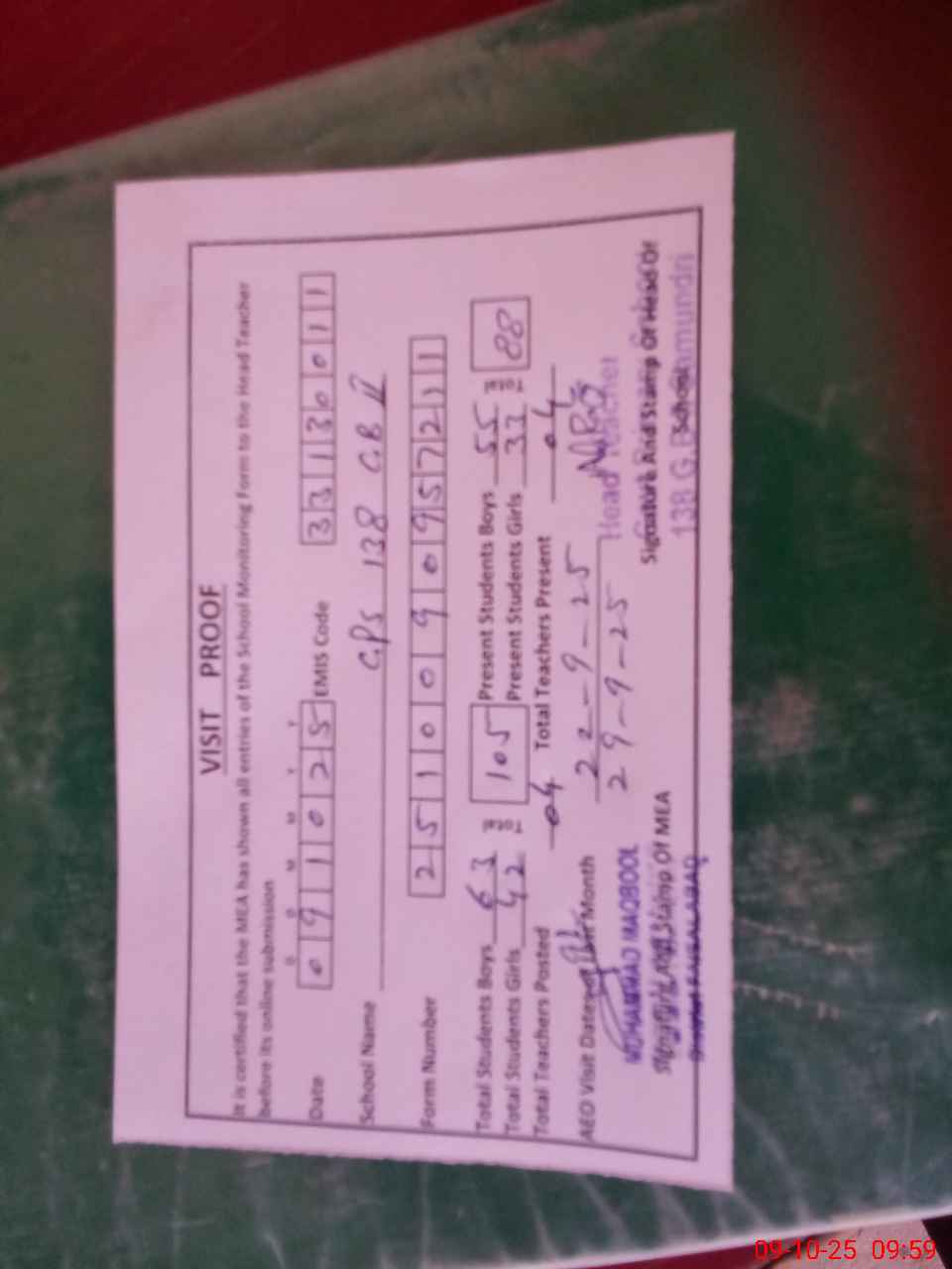 | Attendance Register | Head Teacher | MEA with School | Visit Proof |
