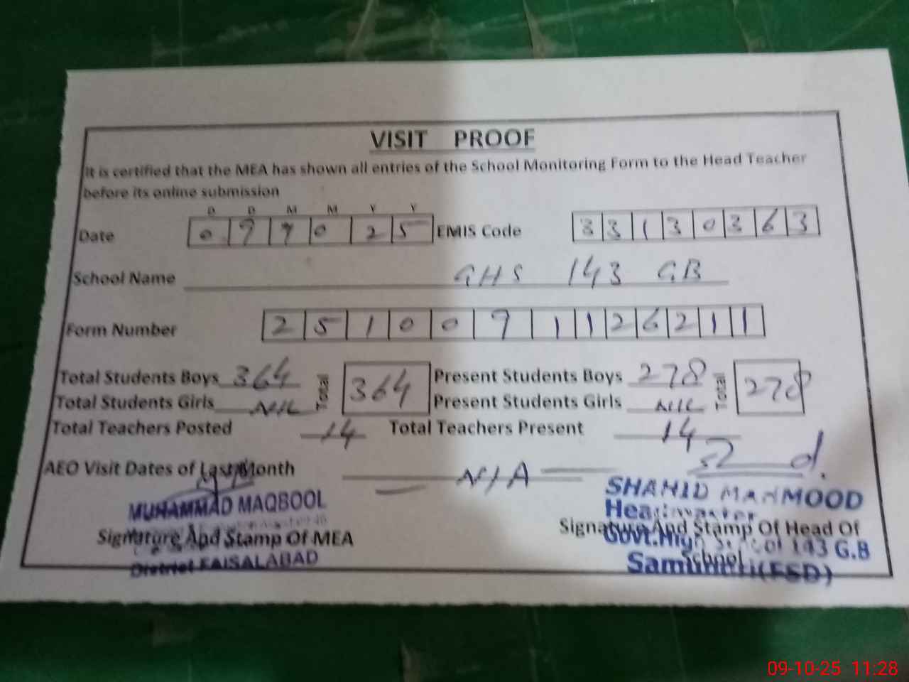 | Certified that this School was Inspected by the Undersigned MEA/DMO Today and the Information Stated Above is as Per Record. | |||||