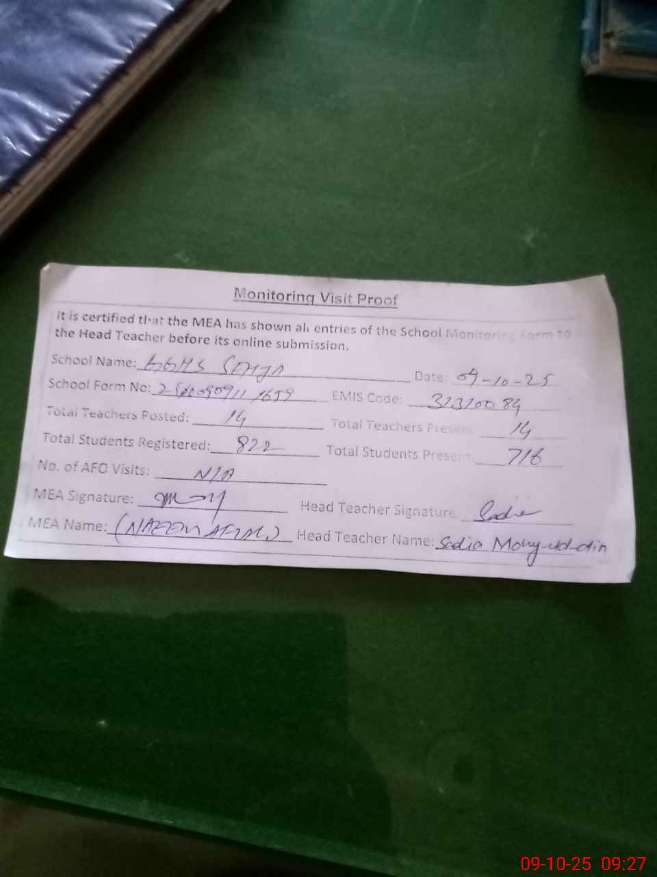| Monitoring Date: 09-10-2025 | Start Time: 09-10-2025 08:07 AM | End Time: 09-10-2025 09:27 AM | Name of MEA: Na**** Af**** | |