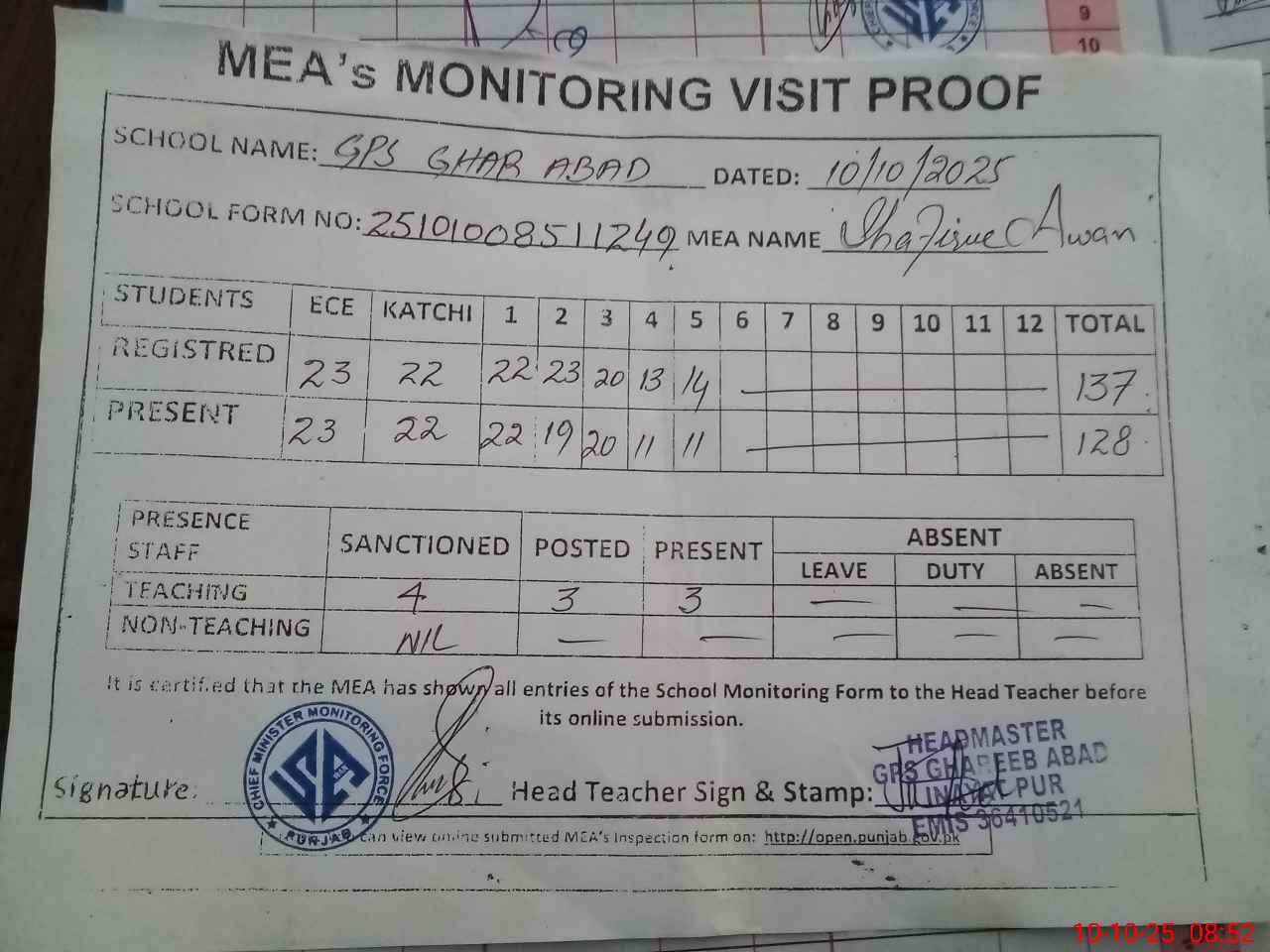 | Attendance Register | Head Teacher | MEA with School | Visit Proof |