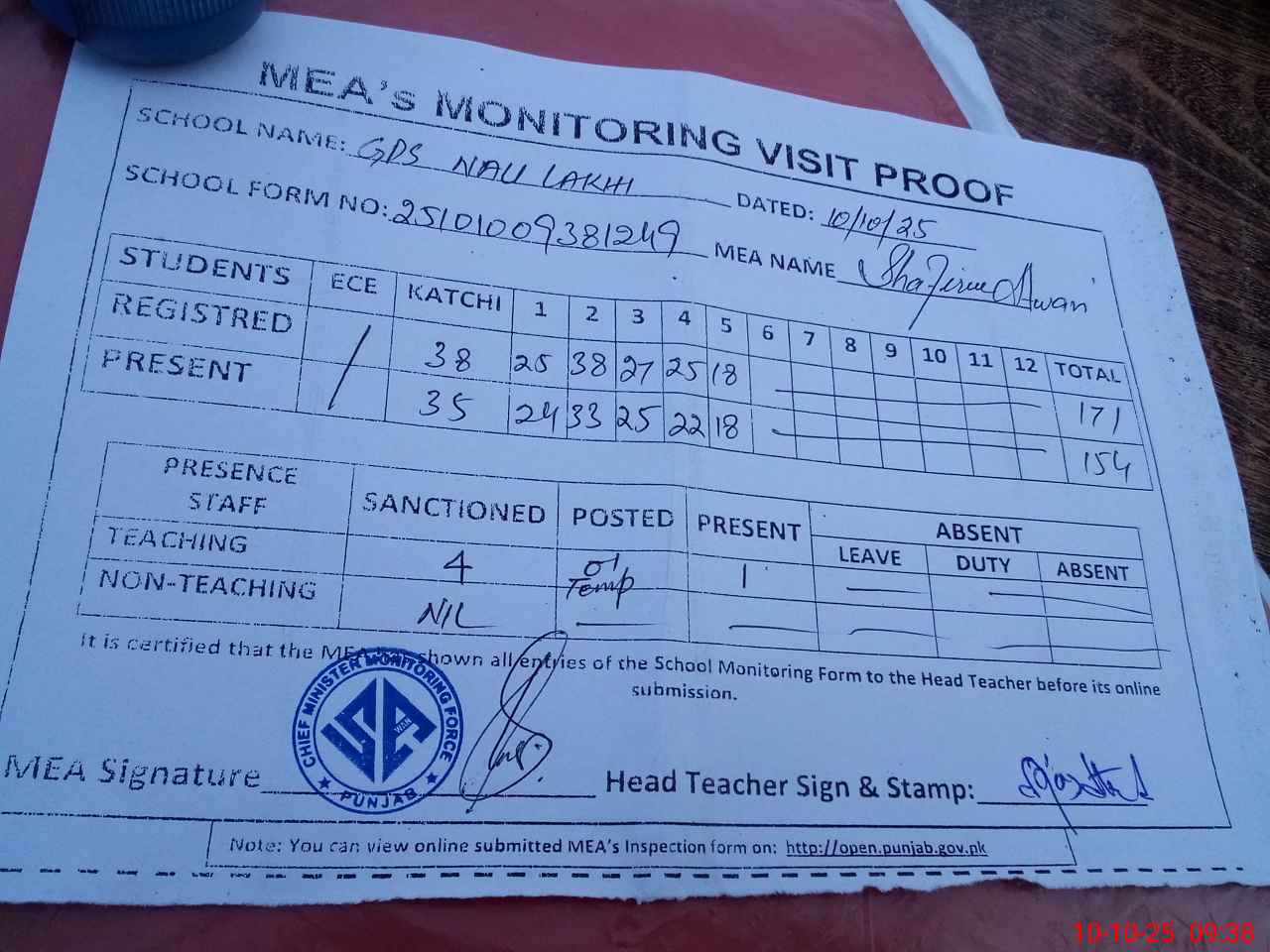| Attendance Register | Head Teacher | MEA with School | Visit Proof |