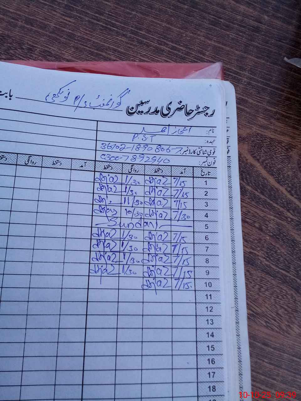 | CNIC | Full Name | Designation | R/C | Absence During Last Calender Month |