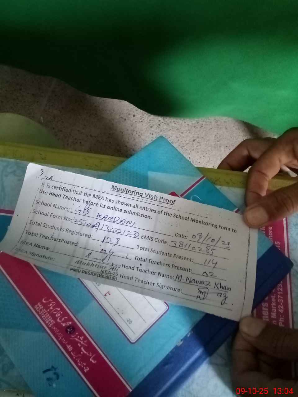 | Attendance Register | Head Teacher | MEA with School | Visit Proof |