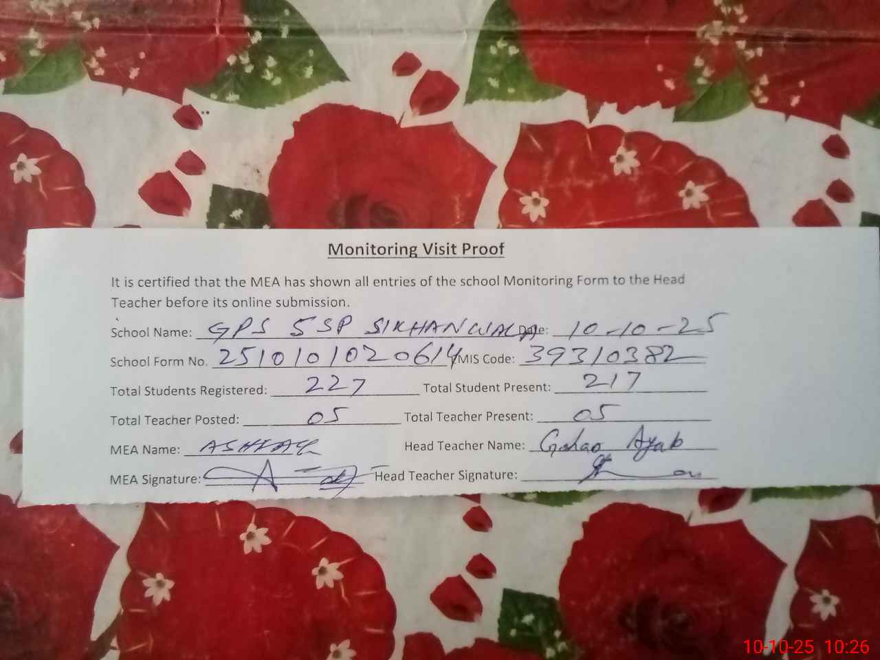 | Attendance Register | Head Teacher | MEA with School | Visit Proof |