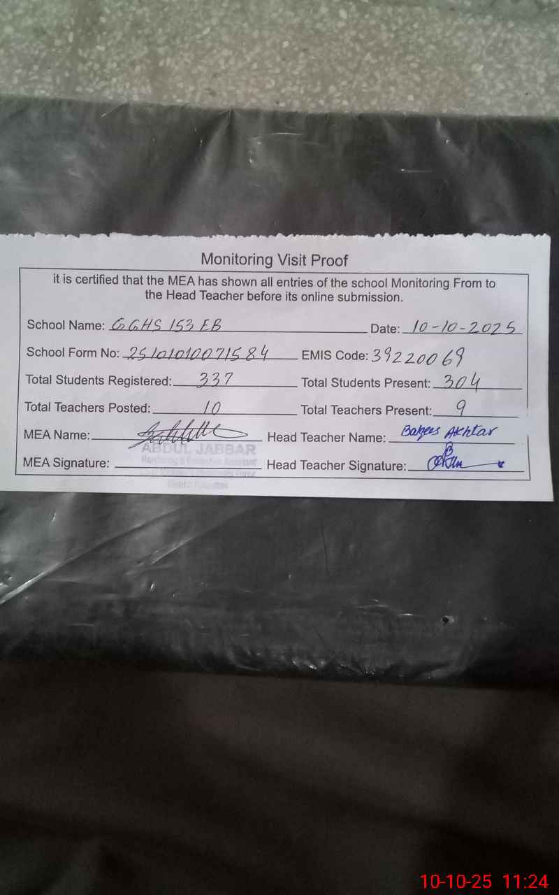 | EMIS Code: 39220069 | Name of School: GGHS 153 EB POST OFFICE CHAK NO 153 EB | |||