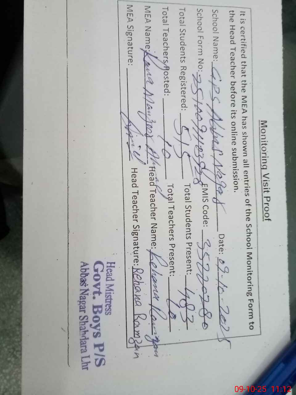 | Certified that this School was Inspected by the Undersigned MEA/DMO Today and the Information Stated Above is as Per Record. | |||||