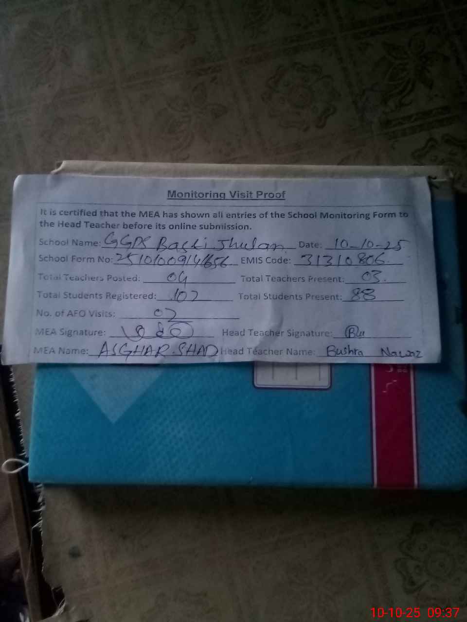| Attendance Register | Head Teacher | MEA with School | Visit Proof |