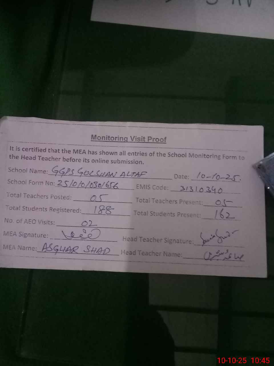 | EMIS Code: 31310340 | Name of School: GGPS GULSHAN ALTAF IRRIGATION COLONY | |||