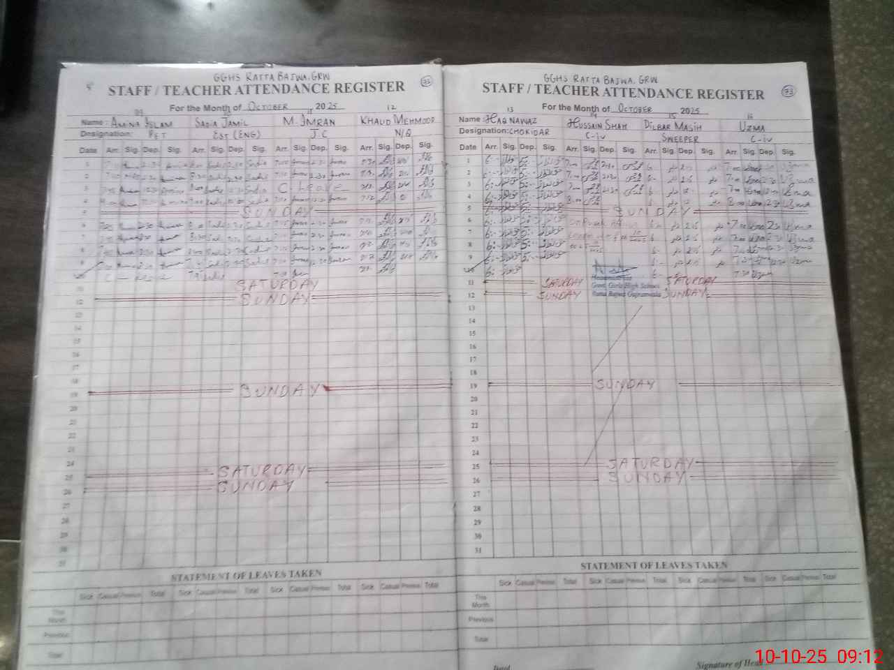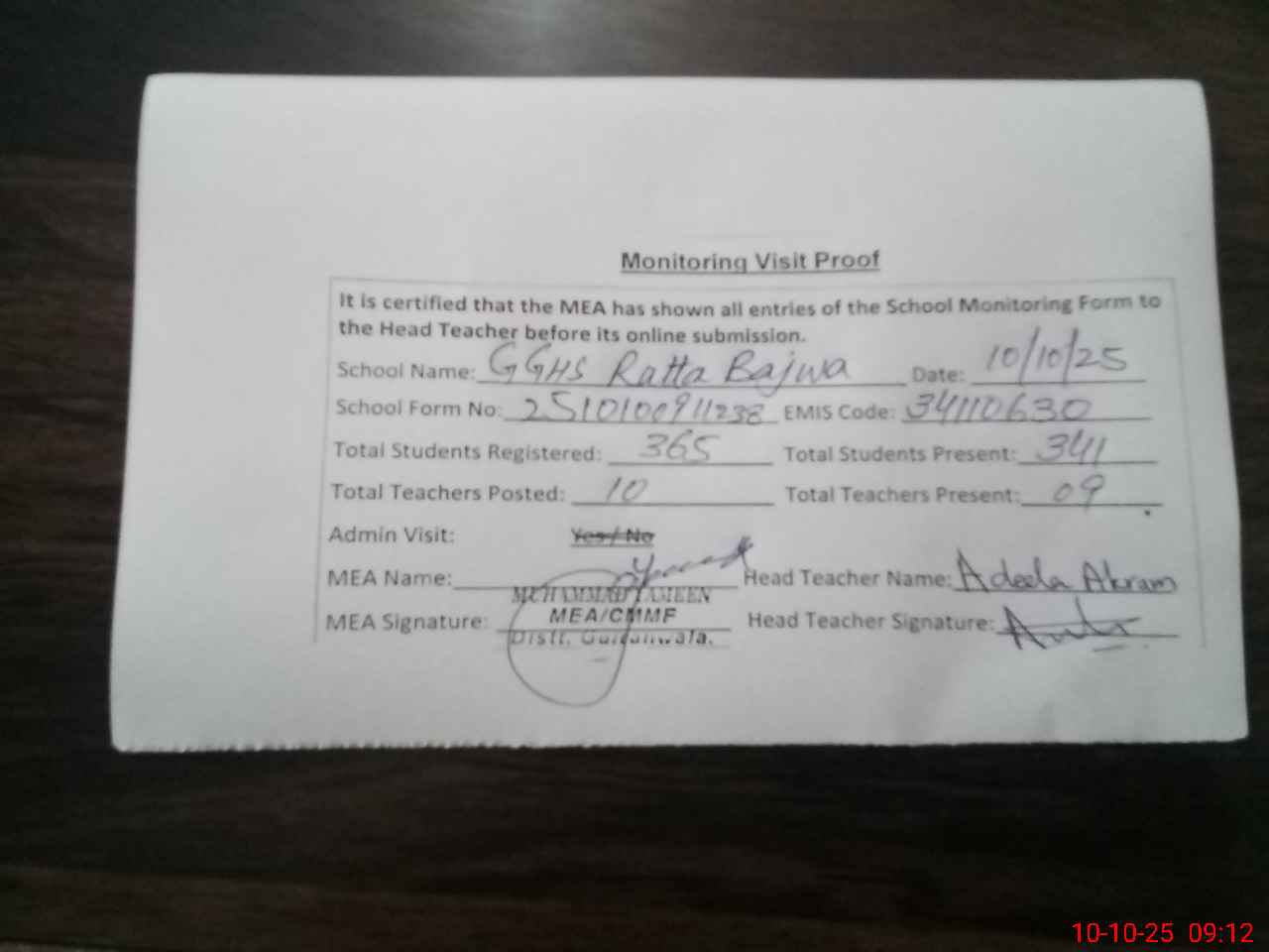 | Attendance Register | Head Teacher | MEA with School | Visit Proof |
