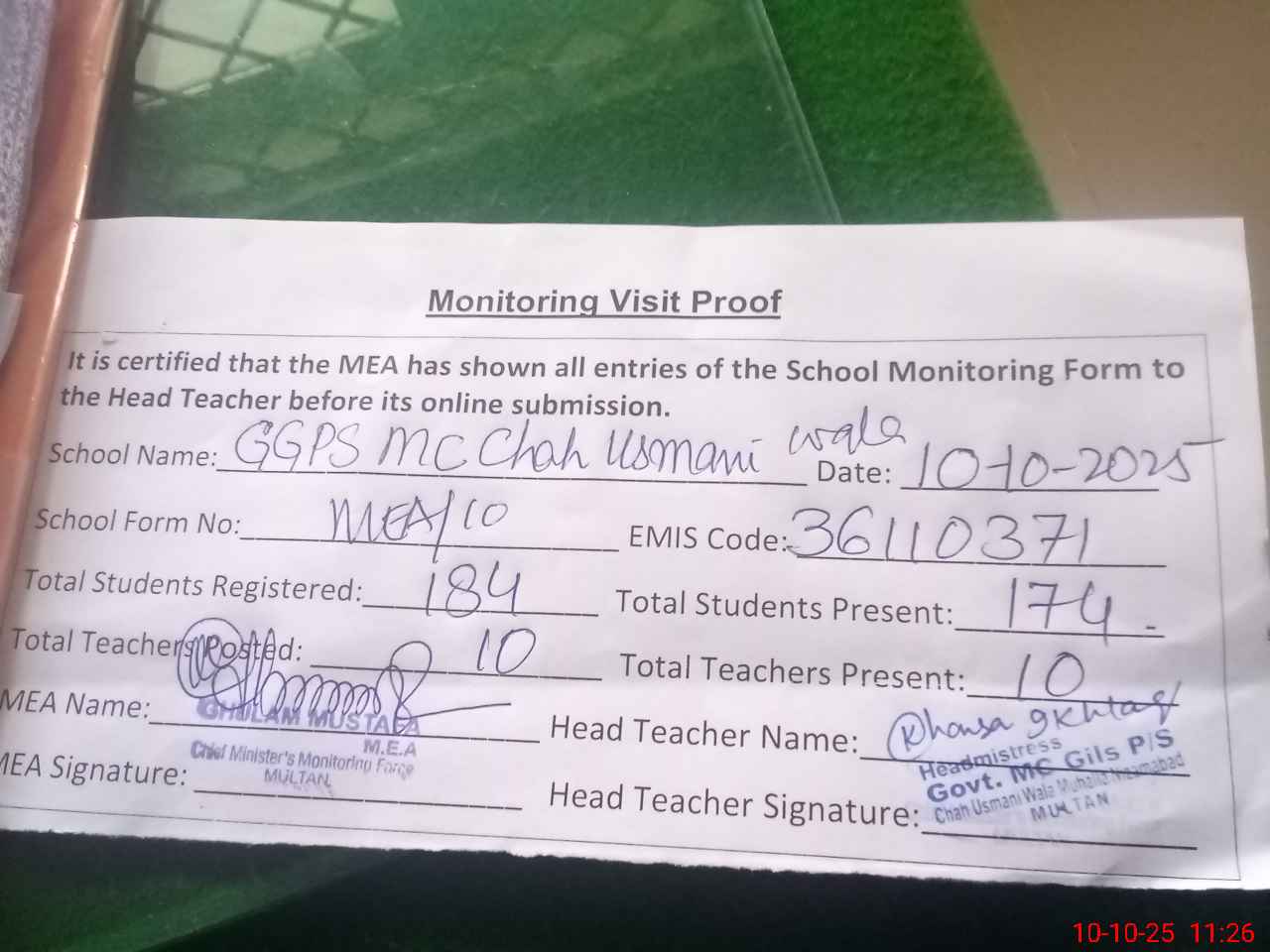 | Monitoring Date: 10-10-2025 | Start Time: 10-10-2025 10:54 AM | End Time: 10-10-2025 11:26 AM | Name of MEA: GH**** MU**** | |
