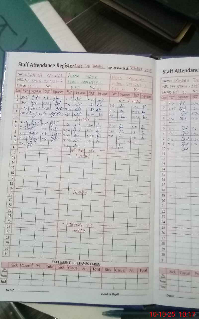 | CNIC | Full Name | Designation | R/C | Absence During Last Calender Month |