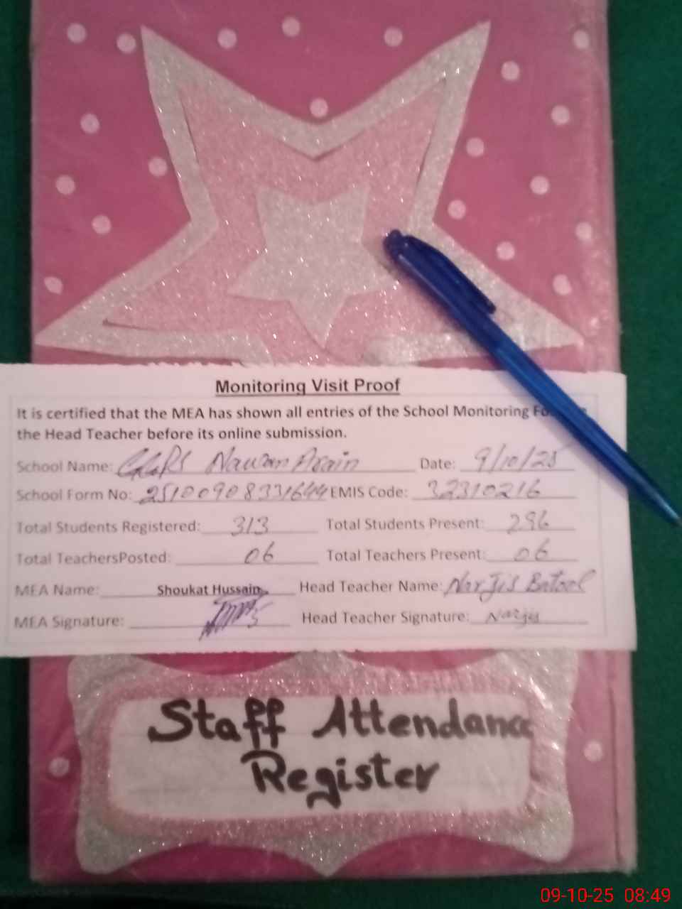 | Attendance Register | Head Teacher | MEA with School | Visit Proof |