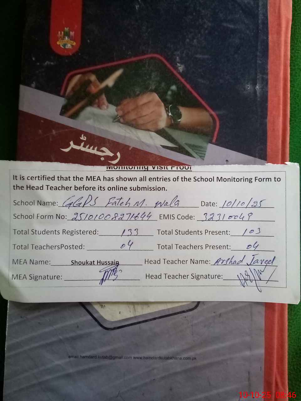| EMIS Code: 32310049 | Name of School: GPS FATEH MUHAMMAD WALA | |||