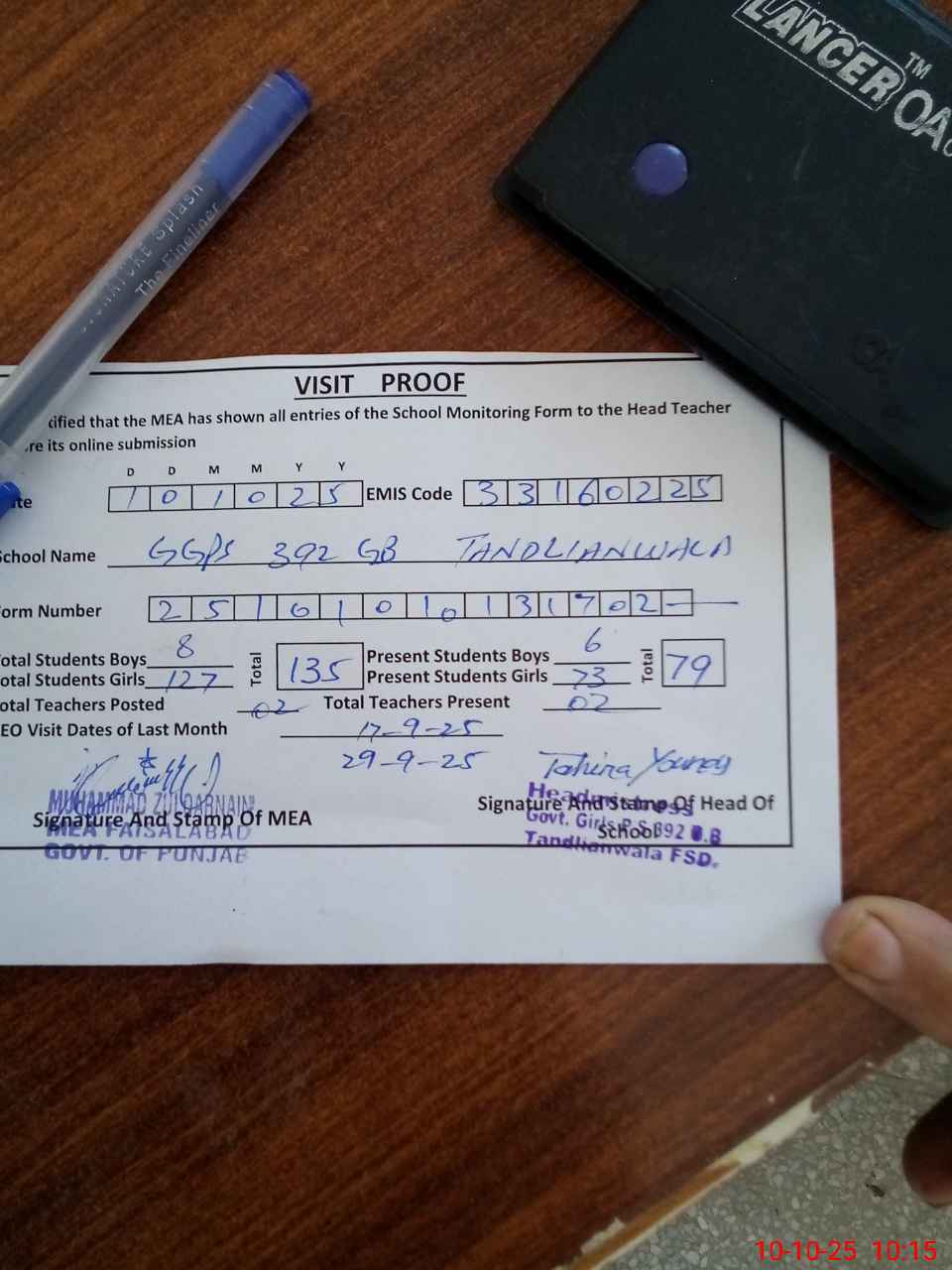 | Certified that this School was Inspected by the Undersigned MEA/DMO Today and the Information Stated Above is as Per Record. | |||||