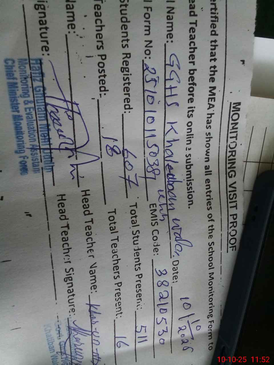 | Certified that this School was Inspected by the Undersigned MEA/DMO Today and the Information Stated Above is as Per Record. | |||||