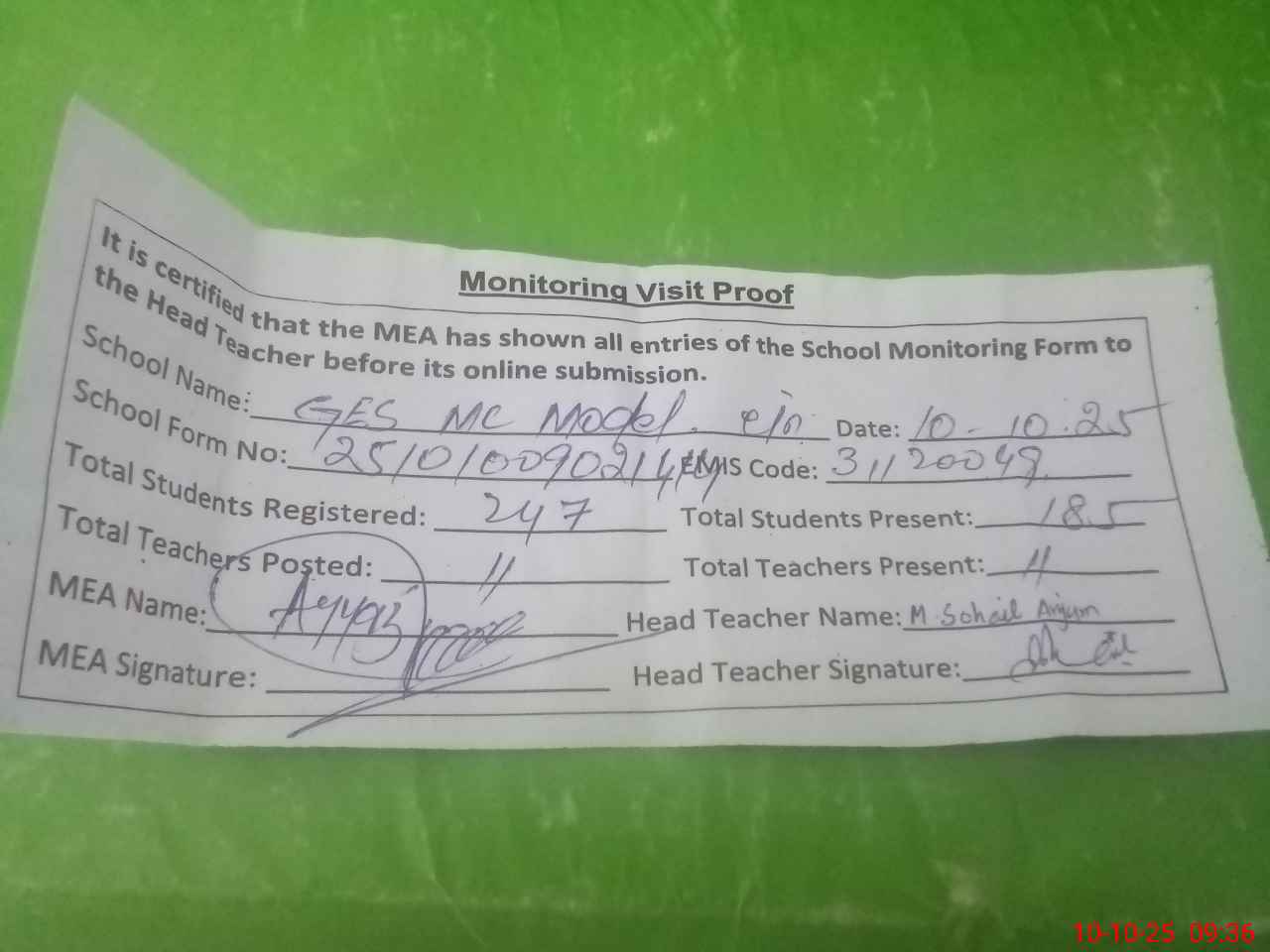 | Monitoring Date: 10-10-2025 | Start Time: 10-10-2025 09:02 AM | End Time: 10-10-2025 09:36 AM | Name of MEA: M.**** HA**** BN**** | |