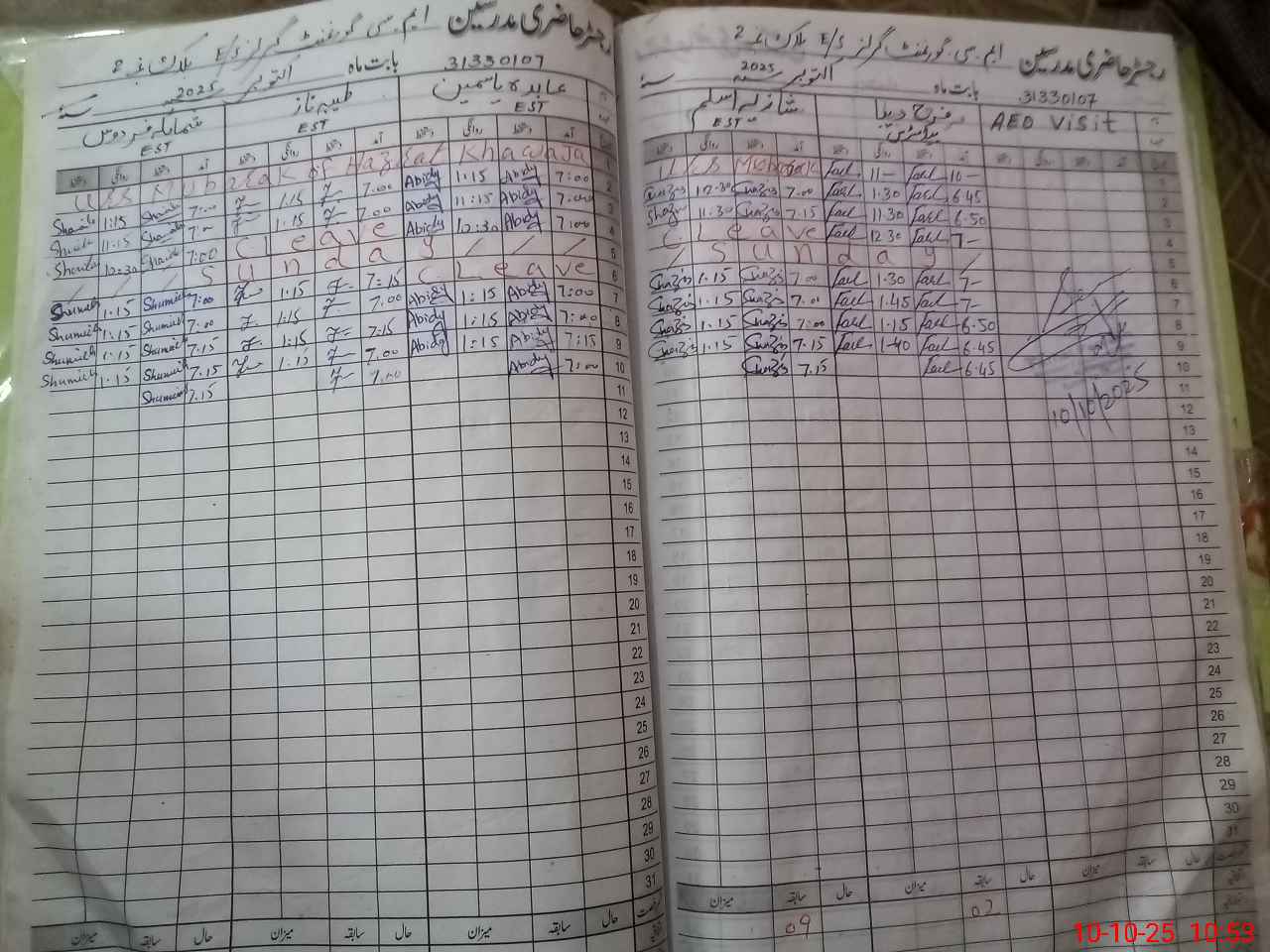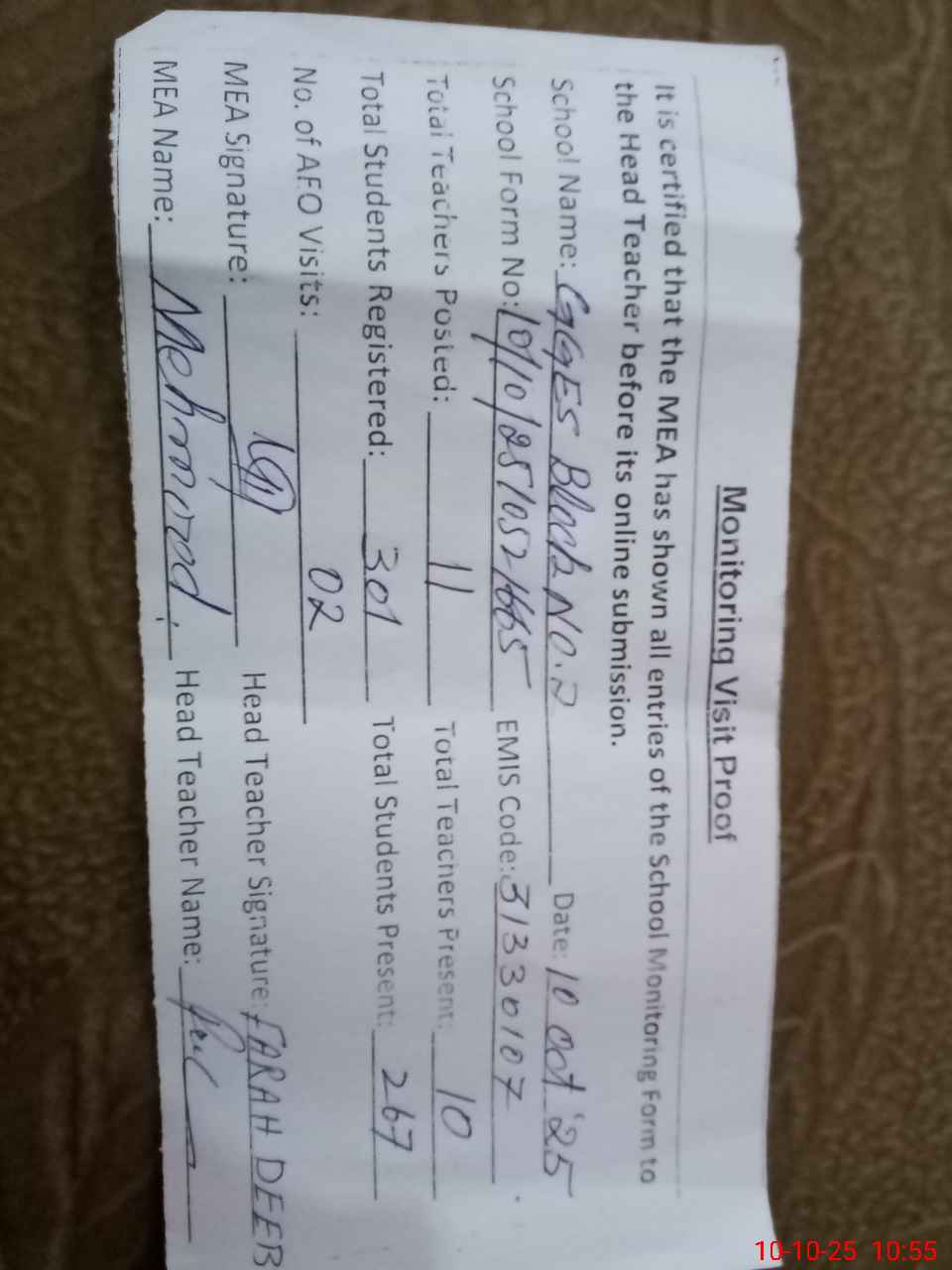 | Monitoring Date: 10-10-2025 | Start Time: 10-10-2025 10:18 AM | End Time: 10-10-2025 10:55 AM | Name of MEA: Ma**** UlHa**** | |