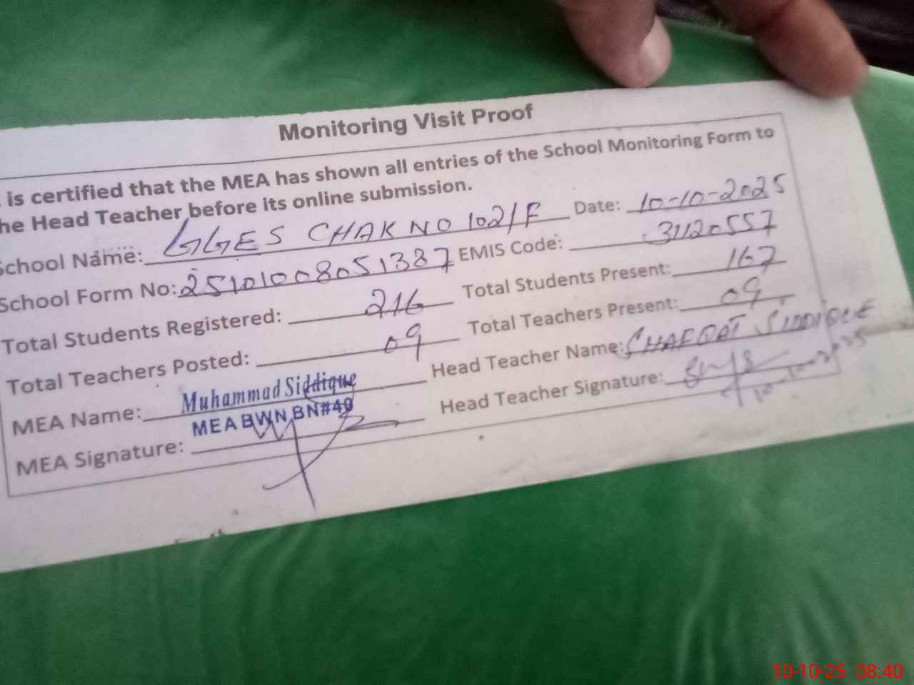 | Certified that this School was Inspected by the Undersigned MEA/DMO Today and the Information Stated Above is as Per Record. | |||||