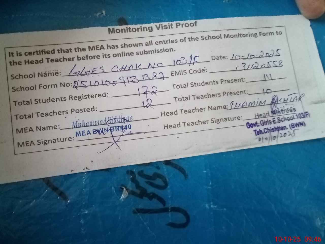 | EMIS Code: 31120558 | Name of School: GGES CHAK NO 103/F | |||