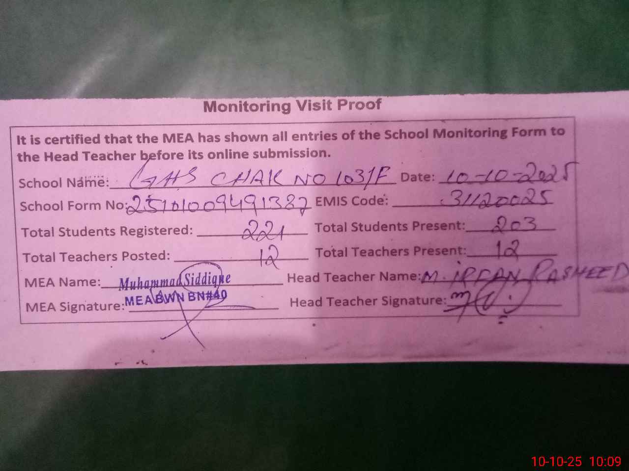 | EMIS Code: 31120025 | Name of School: GHS CHAK NO. 103/F | |||