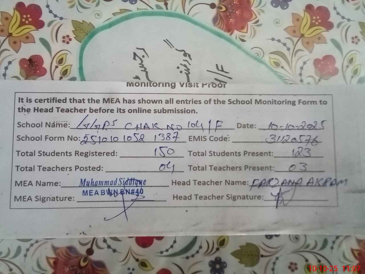 | Attendance Register | Head Teacher | MEA with School | Visit Proof |