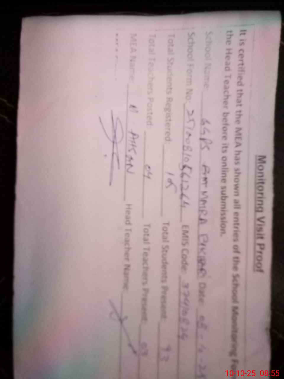| Attendance Register | Head Teacher | MEA with School | Visit Proof |