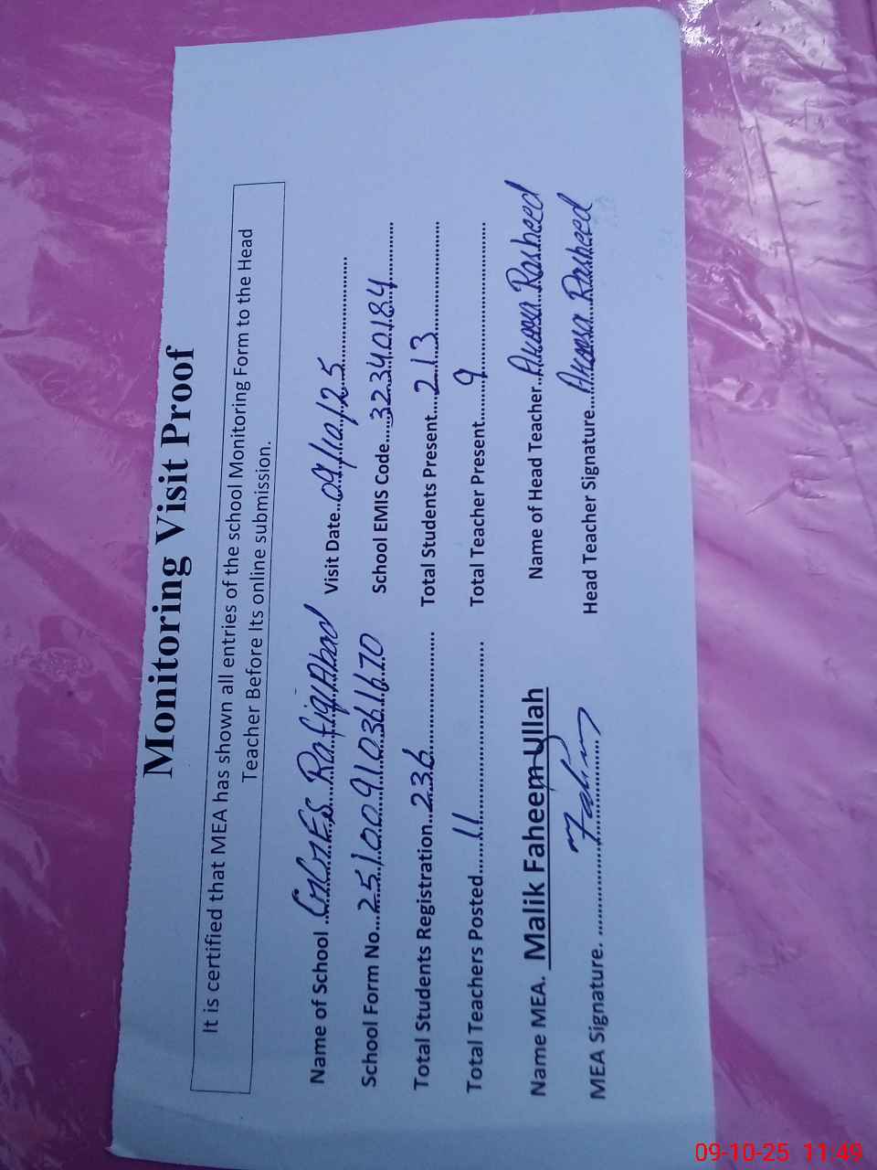 | Attendance Register | Head Teacher | MEA with School | Visit Proof |