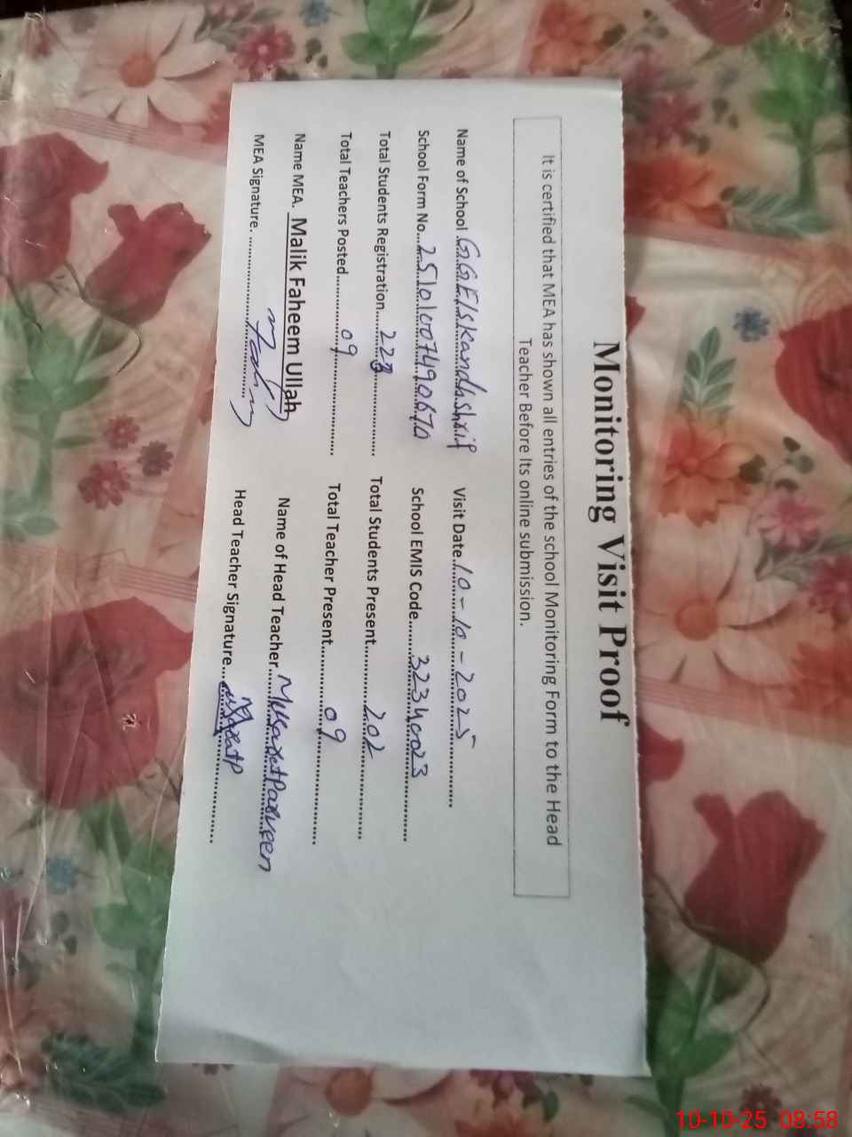 | Attendance Register | Head Teacher | MEA with School | Visit Proof |