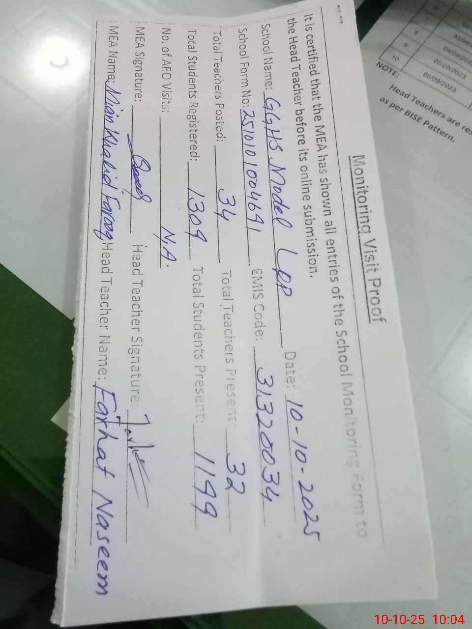 | EMIS Code: 31320034 | Name of School: GGHS MODEL LIAQAT PUR | |||