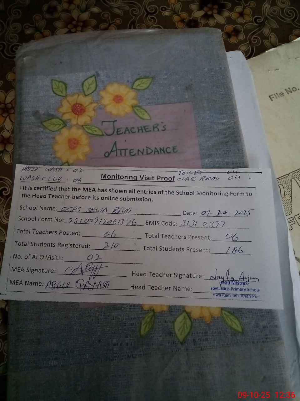 | Attendance Register | Head Teacher | MEA with School | Visit Proof |