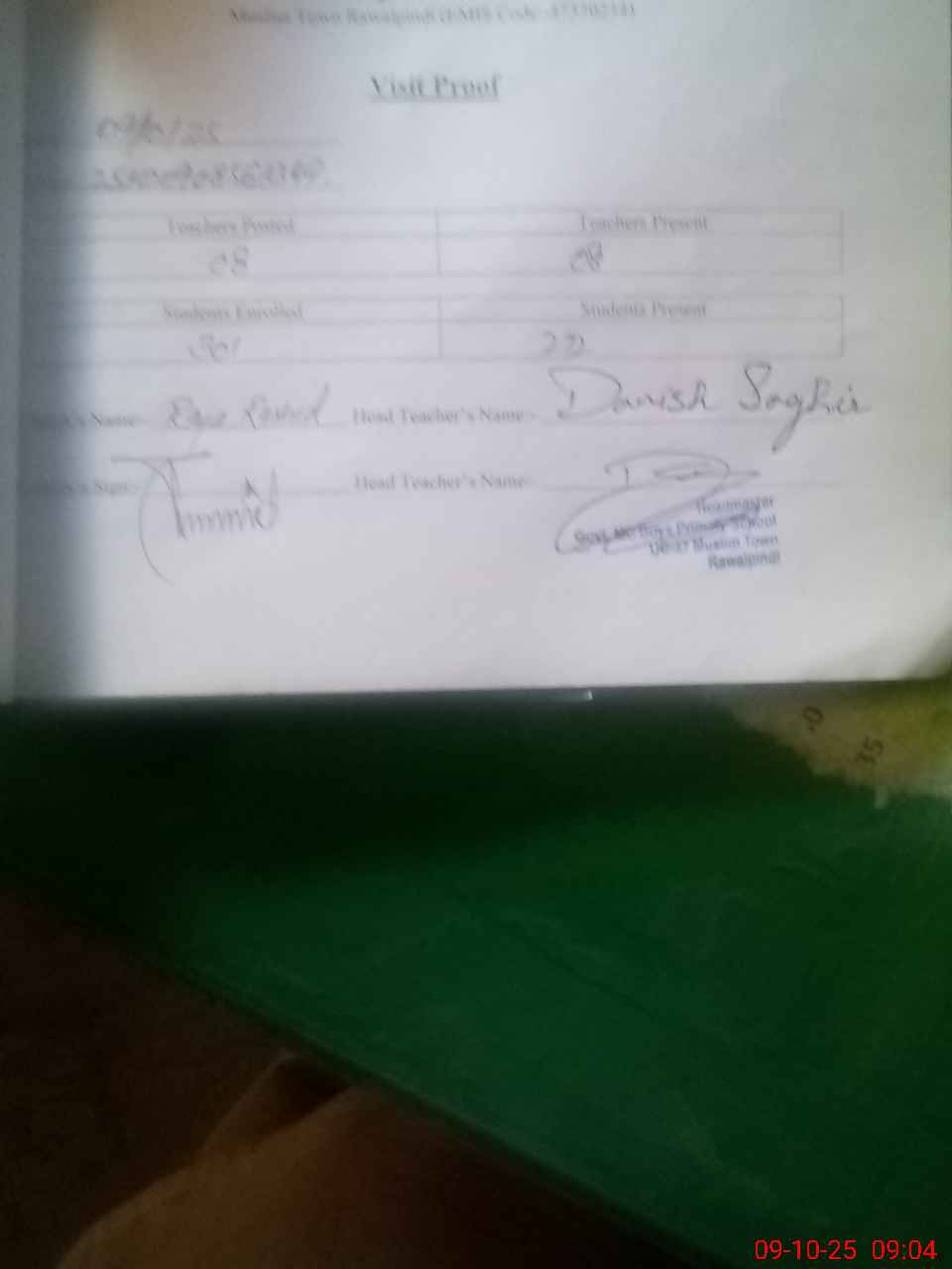 | Attendance Register | Head Teacher | MEA with School | Visit Proof |