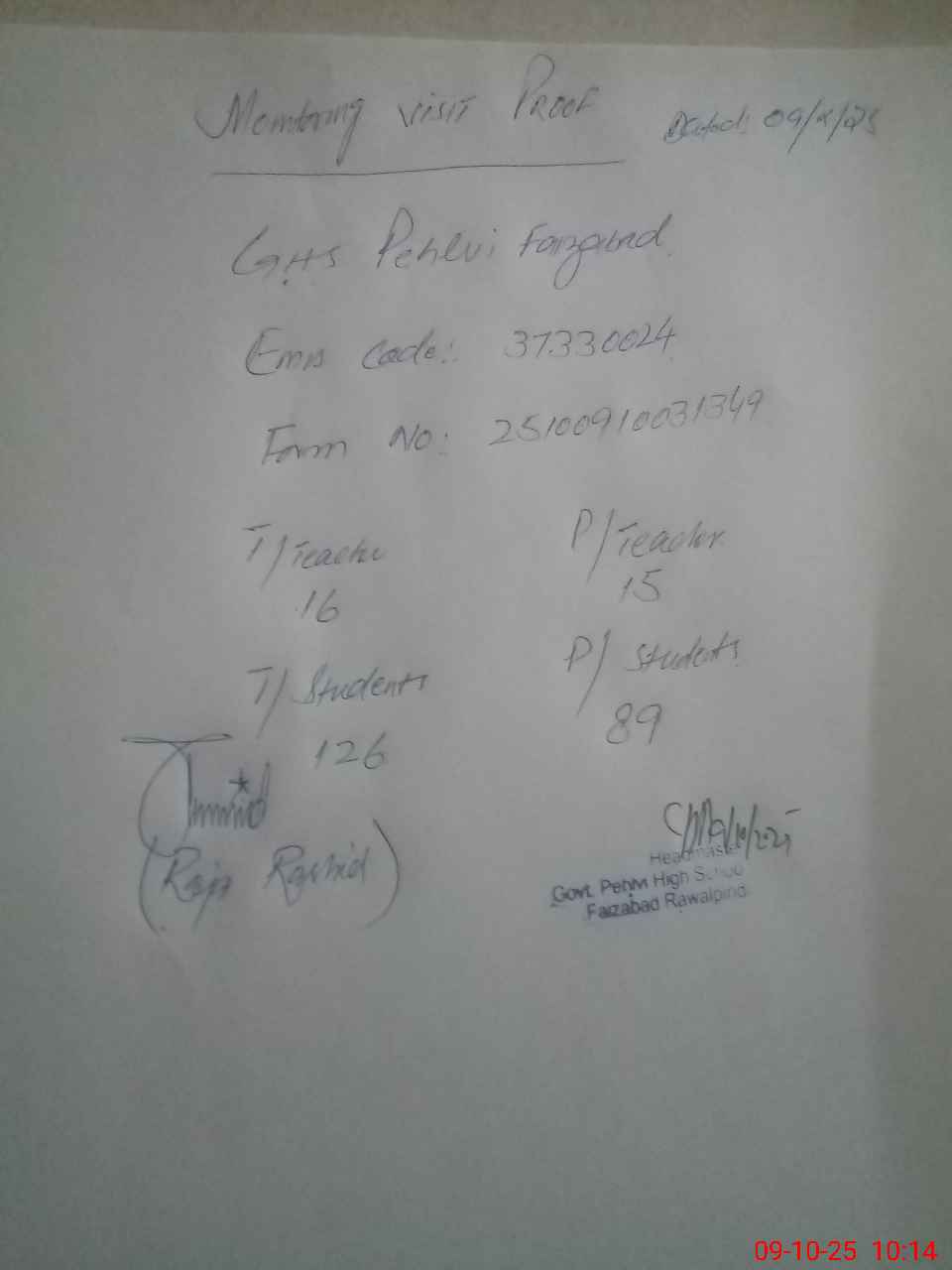| Name: Is**** Al**** Designation: (School Headmaster's/Headmistress's) HM Phone/Cell Number: 03**** |