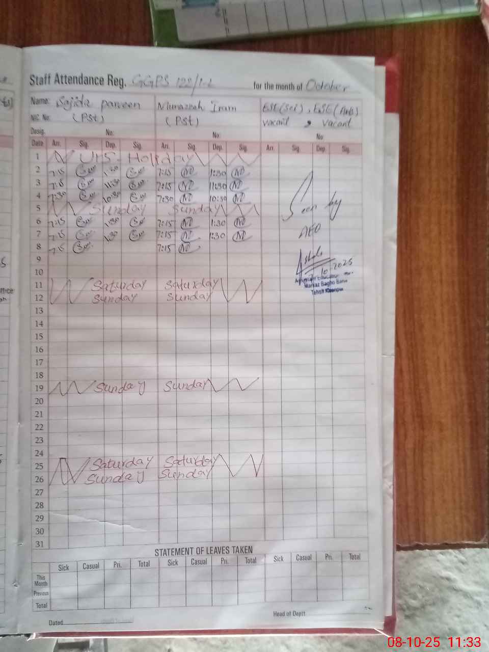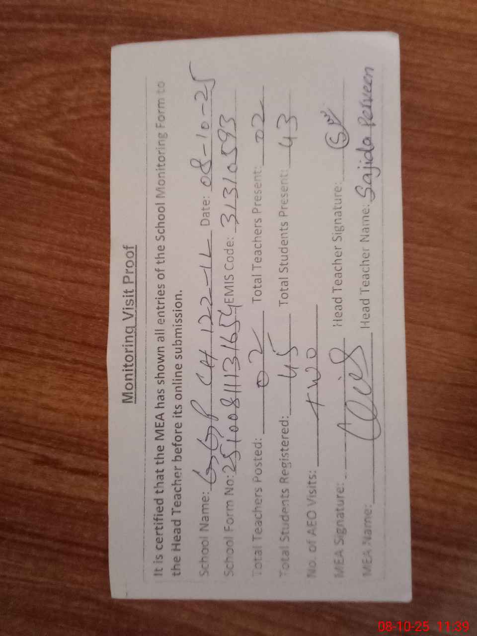 | Attendance Register | Head Teacher | MEA with School | Visit Proof |