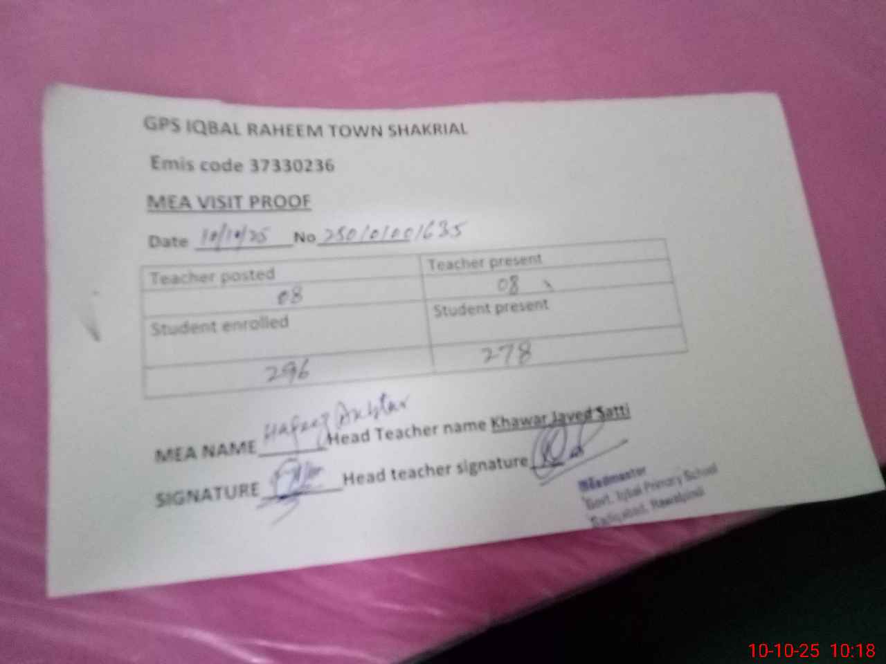 | Name: Mu**** Za**** Kh**** Designation: (School Headmaster's/Headmistress's) PST Phone/Cell Number: 03**** |