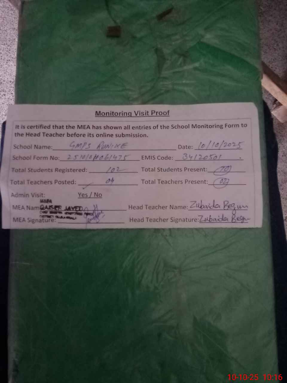 | Monitoring Date: 10-10-2025 | Start Time: 10-10-2025 09:34 AM | End Time: 10-10-2025 10:17 AM | Name of MEA: W-**** Ja**** | |
