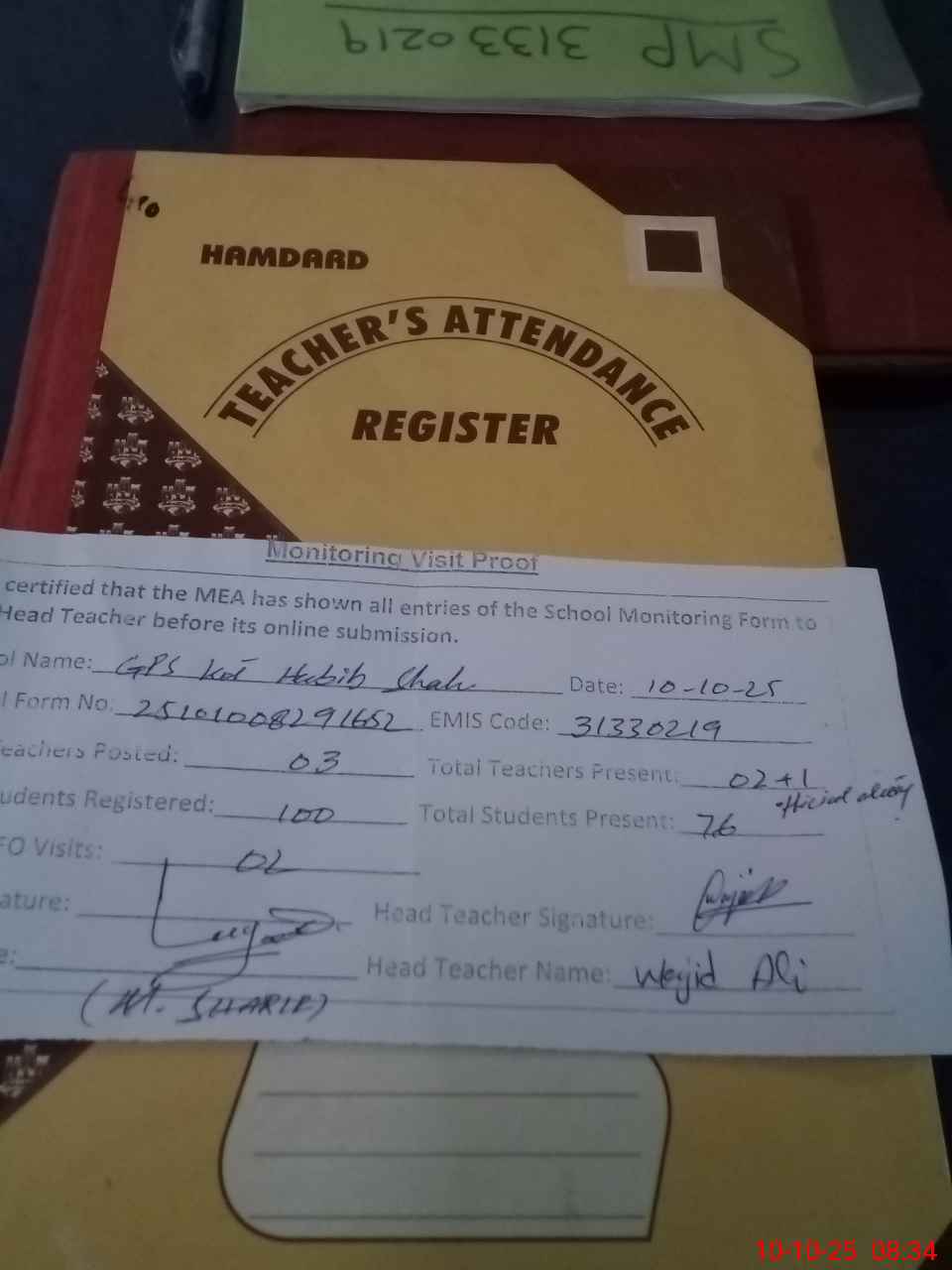 | Attendance Register | Head Teacher | MEA with School | Visit Proof |