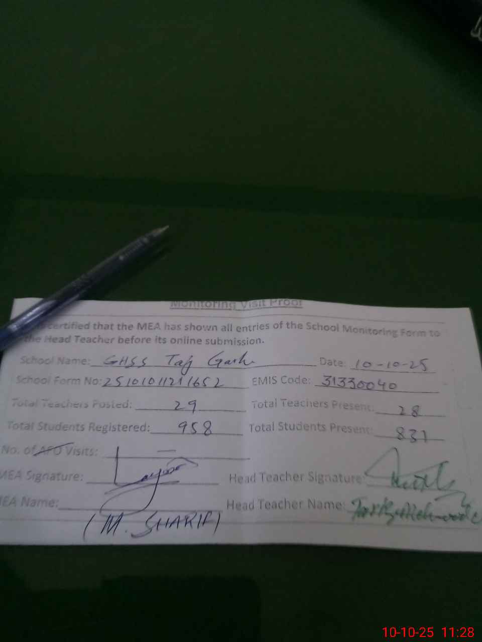 | Attendance Register | Head Teacher | MEA with School | Visit Proof |