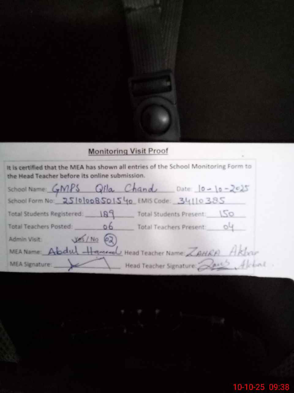 | Attendance Register | Head Teacher | MEA with School | Visit Proof |