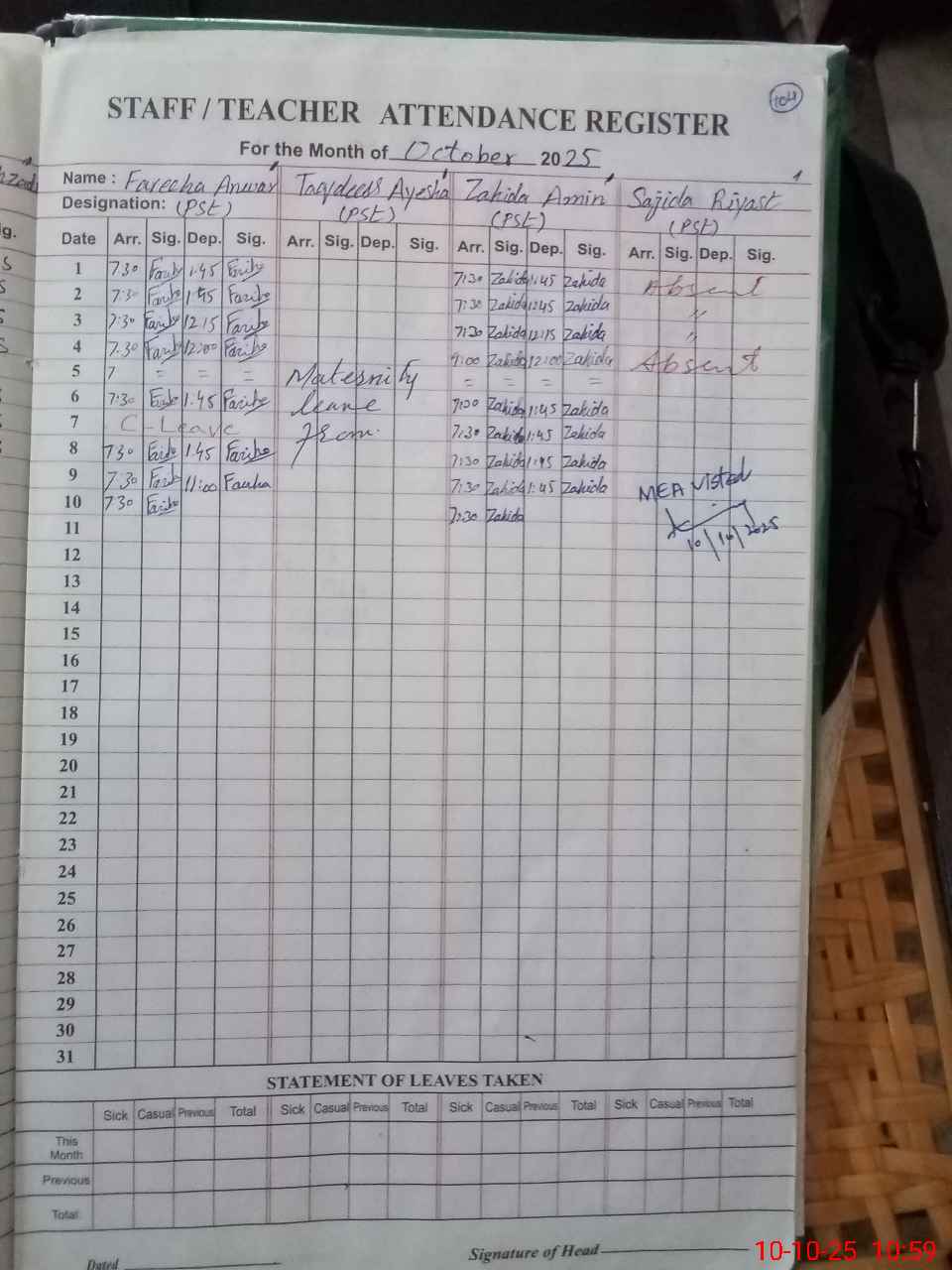 | 34**** | Ta**** Ai**** | PST | Regular | 0 | 0 | 0 | 0 | 0 | 0 | 0 | 0 | 0 | Maternity |