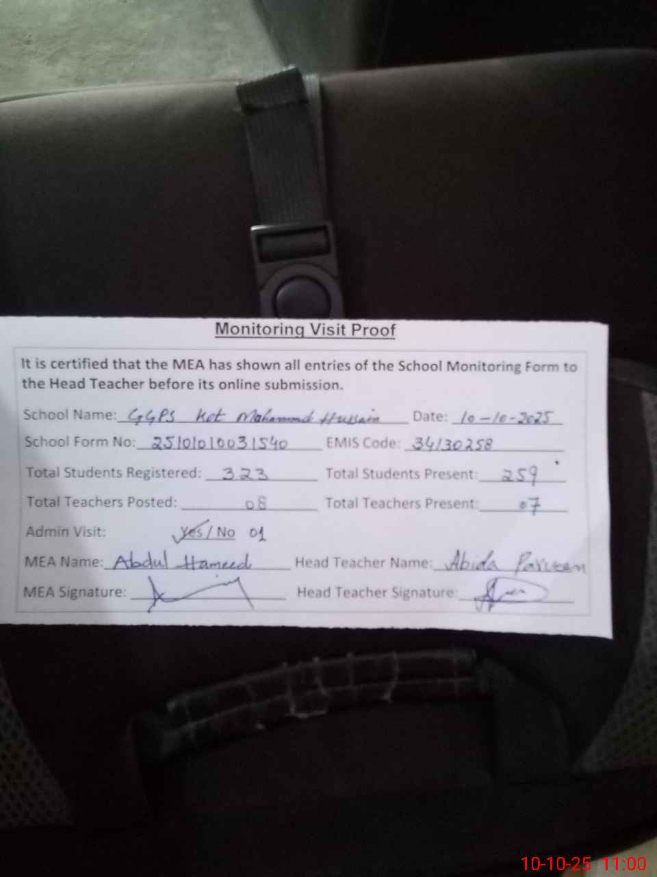| Attendance Register | Head Teacher | MEA with School | Visit Proof |