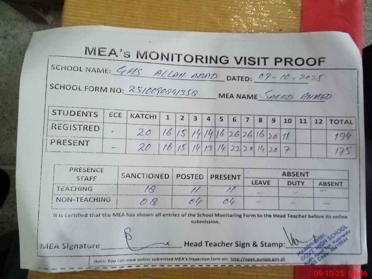 | Attendance Register | Head Teacher | MEA with School | Visit Proof |