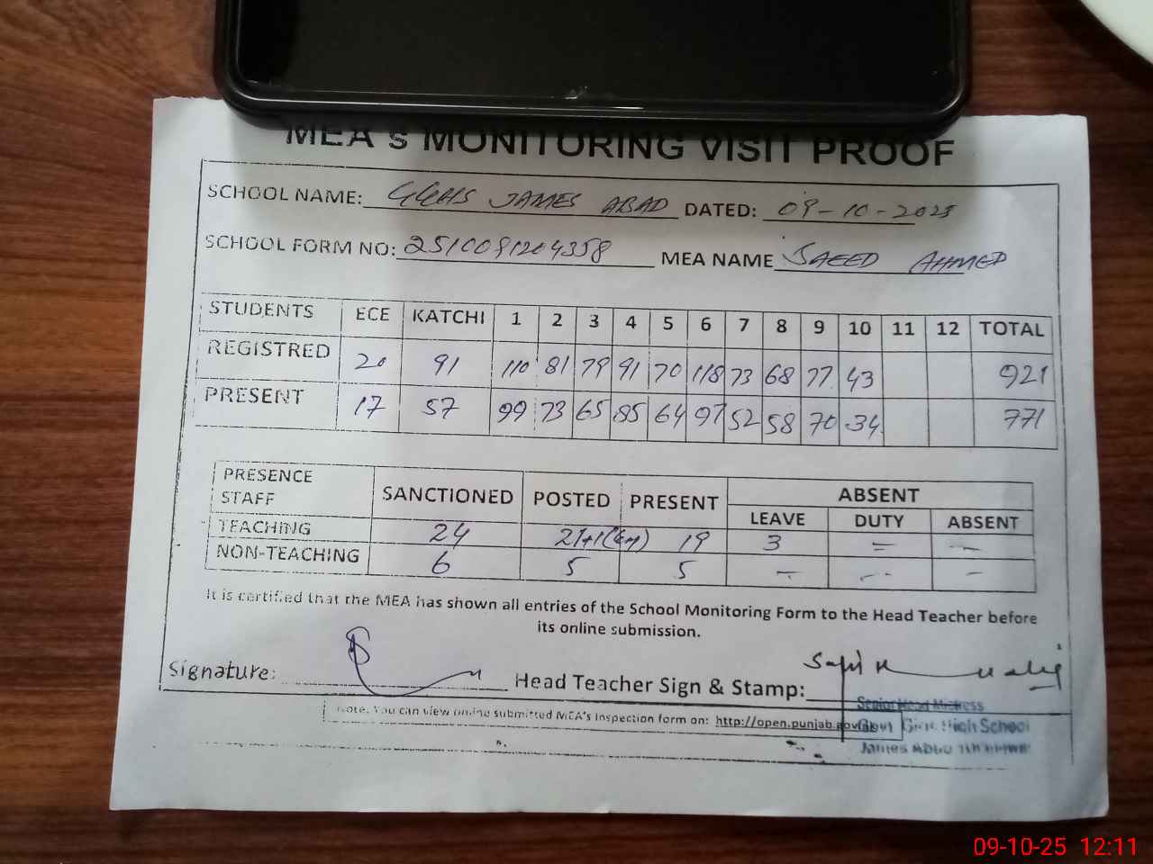 | Attendance Register | Head Teacher | MEA with School | Visit Proof |