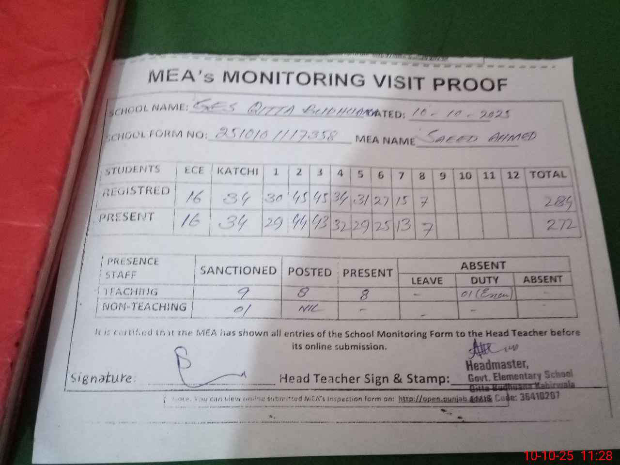 | Attendance Register | Head Teacher | MEA with School | Visit Proof |