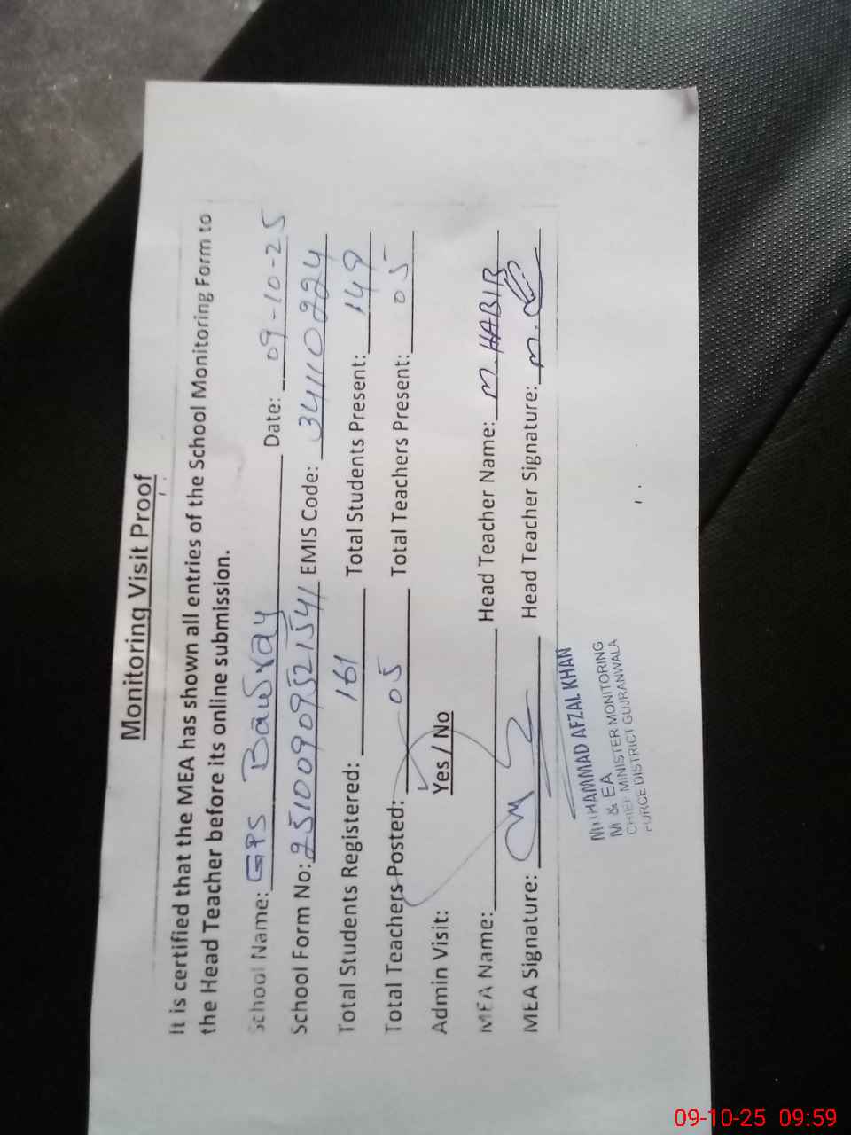 | Monitoring Date: 09-10-2025 | Start Time: 09-10-2025 09:35 AM | End Time: 09-10-2025 10:04 AM | Name of MEA: N-**** Af**** Kh**** | |