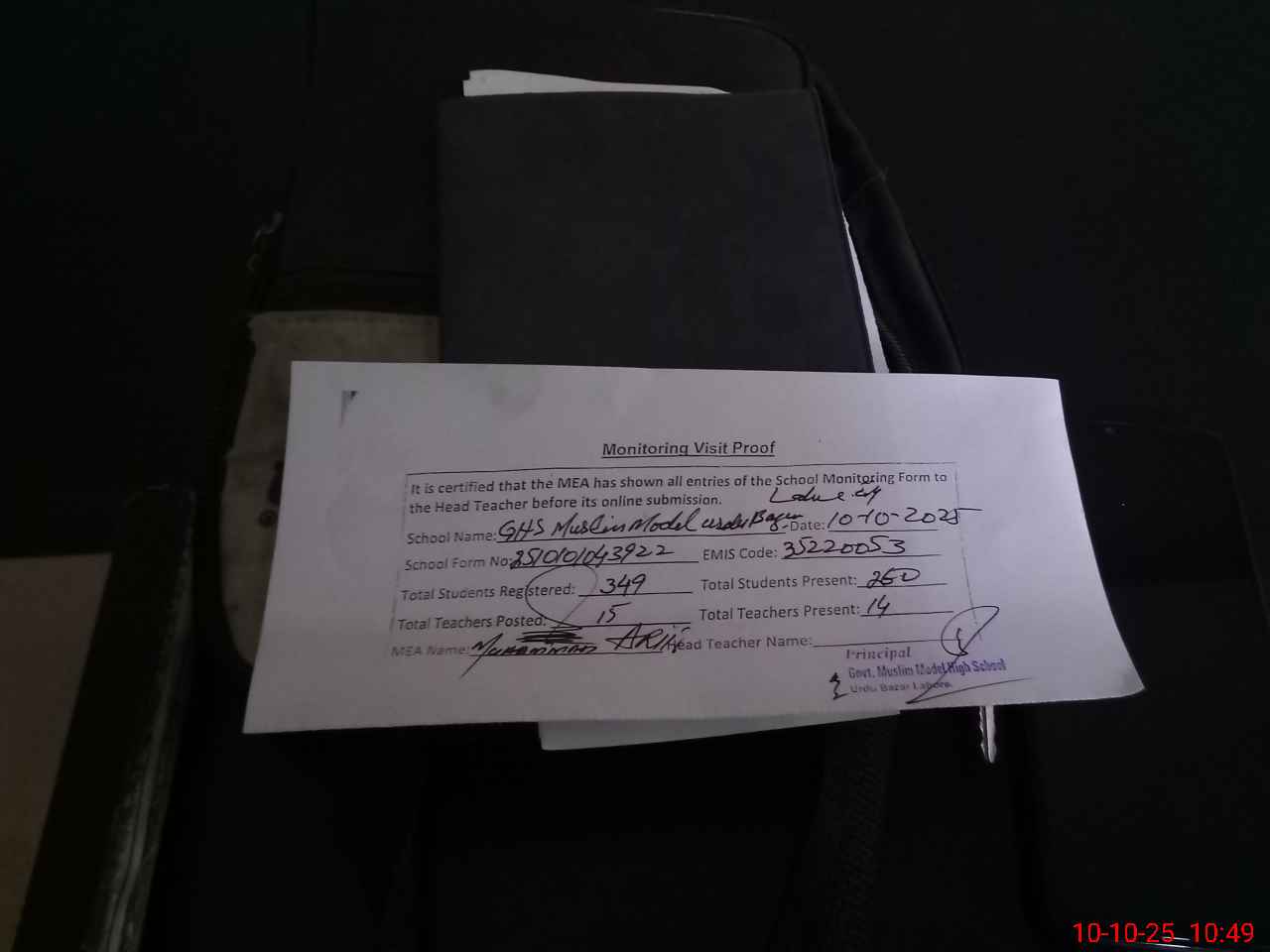 | Certified that this School was Inspected by the Undersigned MEA/DMO Today and the Information Stated Above is as Per Record. | |||||