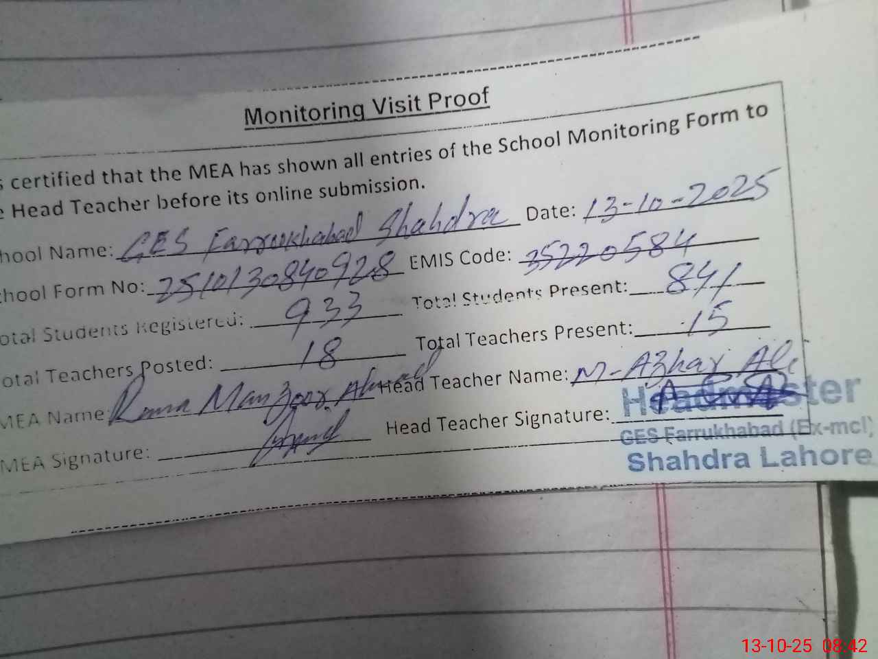 | EMIS Code: 35220584 | Name of School: GES FARRUKH ABAD SHAHDARA (EX-MCL) | |||