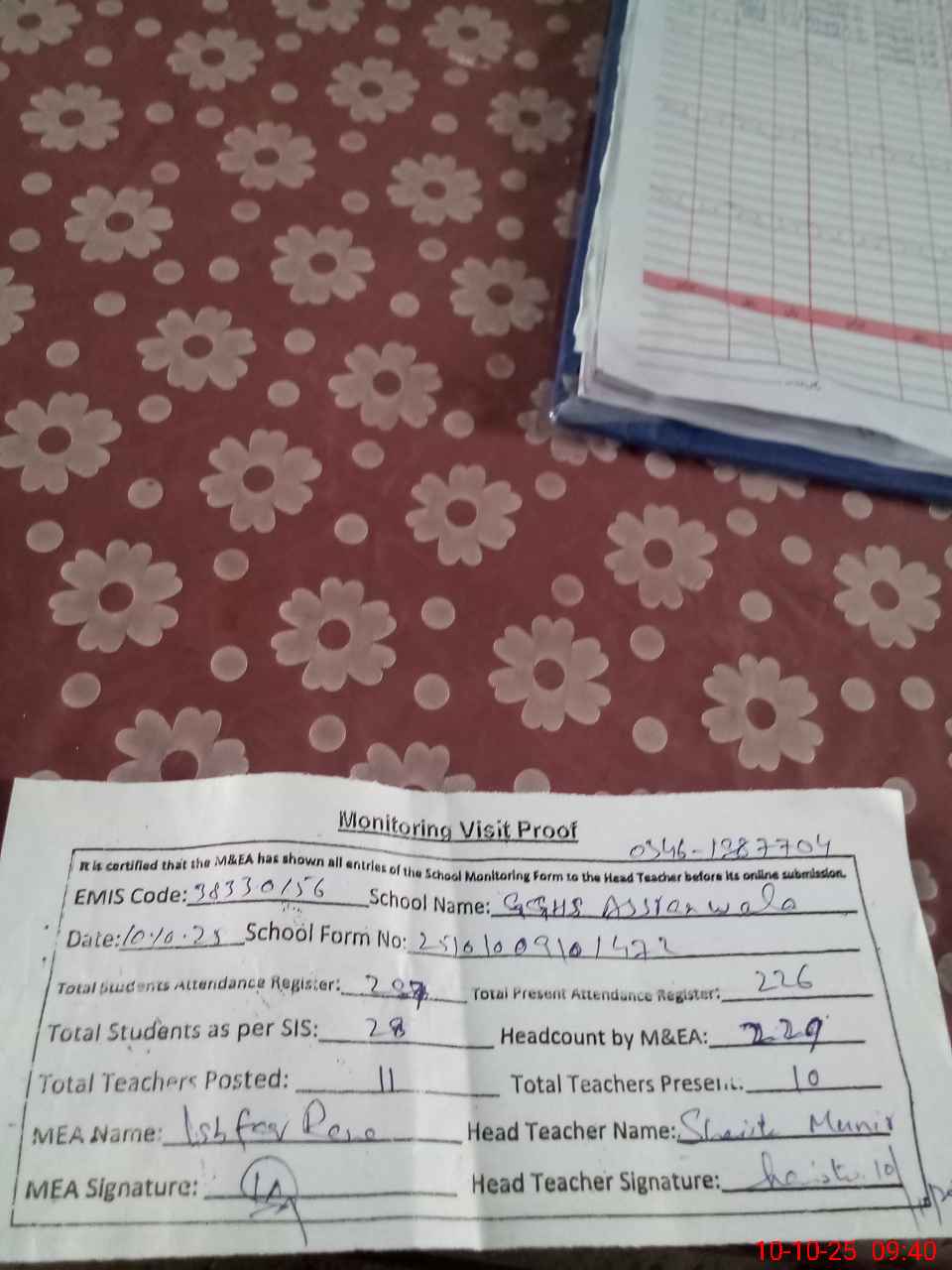 | Attendance Register | Head Teacher | MEA with School | Visit Proof |