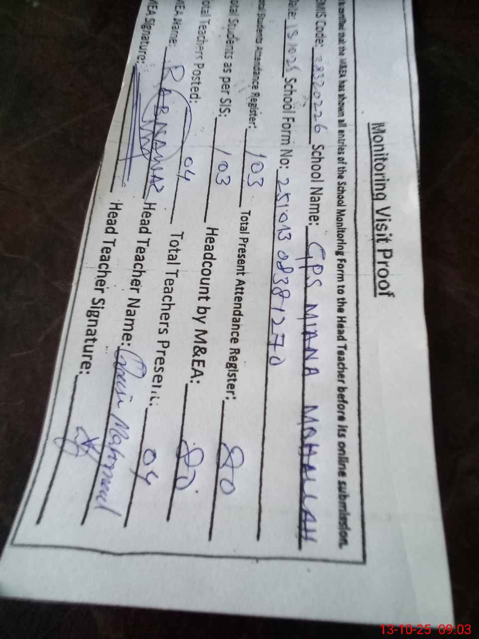 | Attendance Register | Head Teacher | MEA with School | Visit Proof |
